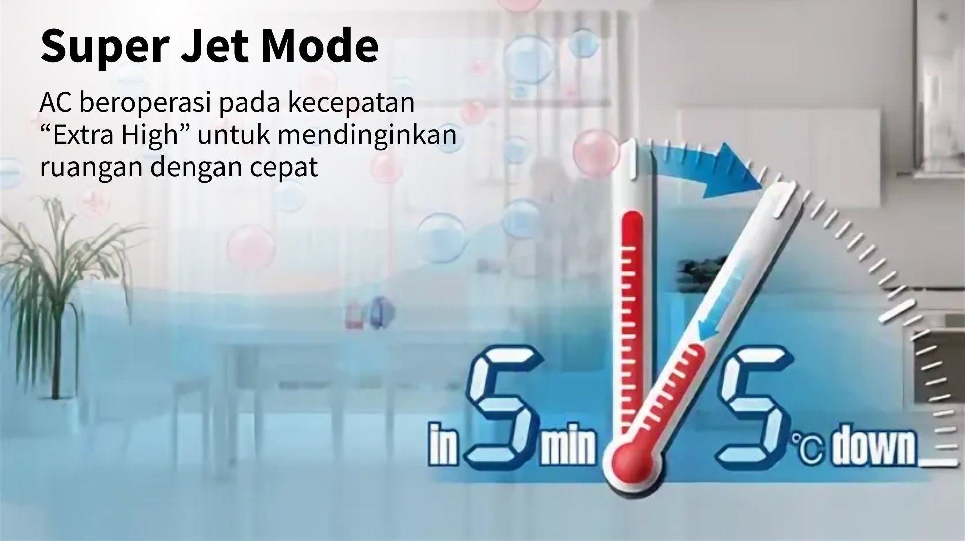 - Turbo Cooling: Fitur ini memungkinkan AC beroperasi pada kecepatan kipas ekstra tinggi untuk mendinginkan ruangan secara instan, memberikan kesejukan cepat saat Anda membutuhkannya.
